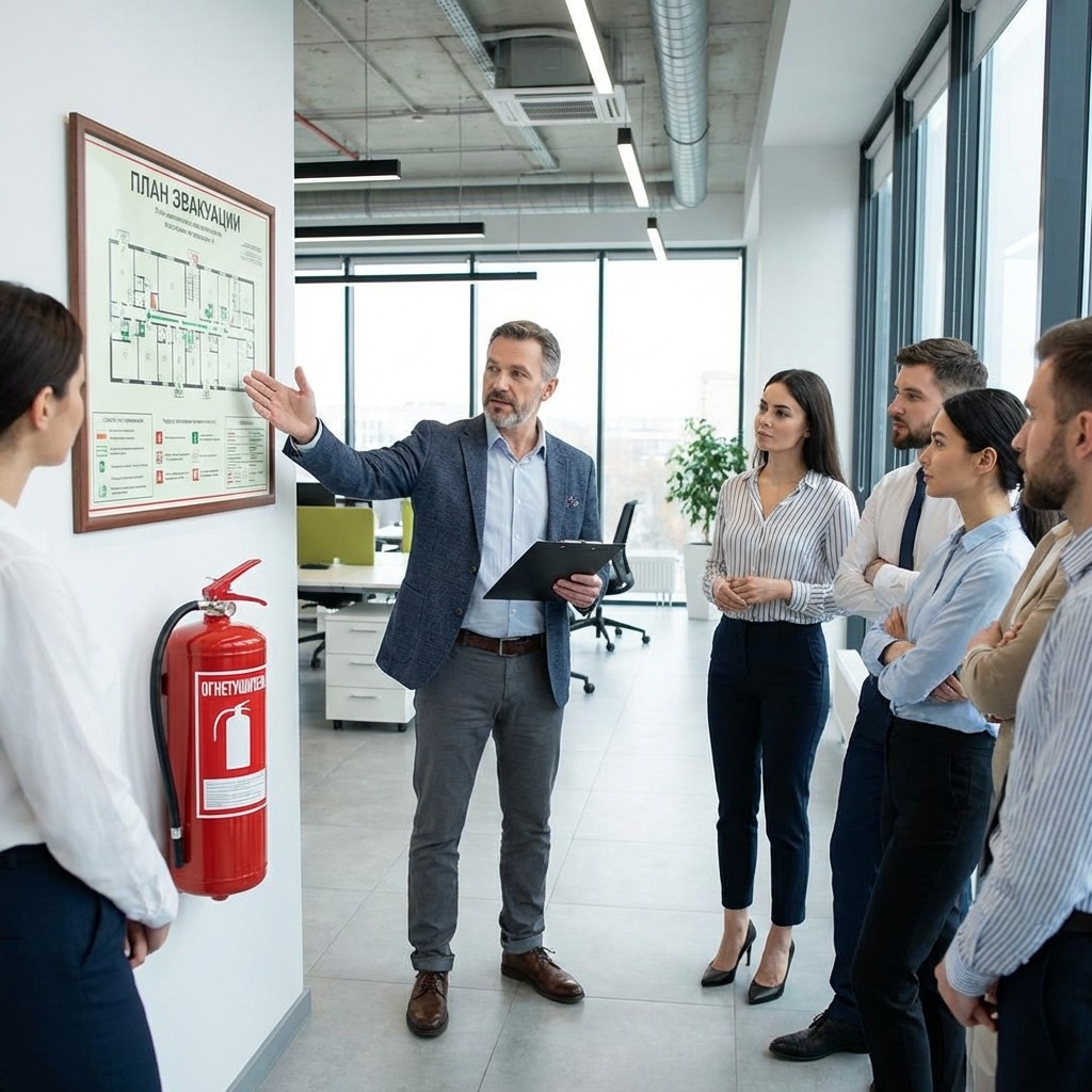 Работник должен знать, где находятся эвакуационные выходы, как действовать при возгорании, как пользоваться первичными средствами тушения, кому сообщать о неисправностях и что запрещено делать в помещениях. Для этого проводится инструктаж по пожарной безопасности, а его прохождение фиксируется в документах.